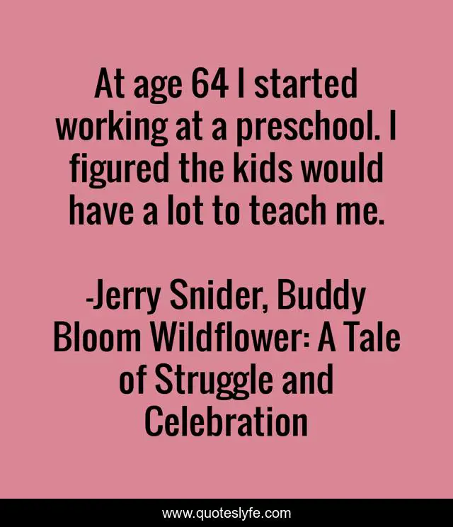This page presents the quote "At age 64 I started working at a preschool. I figured the kids would have a lot to teach me.". Author of this quote is Jerry Snider, Buddy Bloom Wildflower: A Tale of Struggle and Celebration. .
