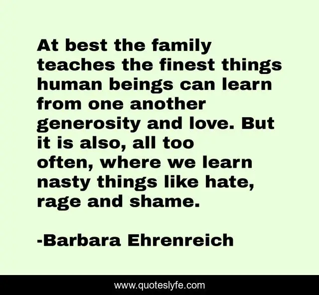 This page presents the quote "At best the family teaches the finest things human beings can learn from one another generosity and love. But it is also, all too often, where we learn nasty things like hate, rage and shame.". Author of this quote is Barbara Ehrenreich. .