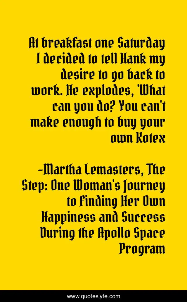 This page presents the quote "At breakfast one Saturday I decided to tell Hank my desire to go back to work. He explodes, 'What can you do? You can't make enough to buy your own Kotex". Author of this quote is Martha Lemasters, The Step: One Woman's Journey to Finding Her Own Happiness and Success During the Apollo Space Program. This quote is about feminism, women-rights, history,.