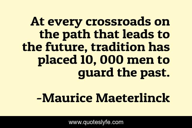 This page presents the quote "At every crossroads on the path that leads to the future, tradition has placed 10, 000 men to guard the past.". Author of this quote is Maurice Maeterlinck. This quote is about past, path, men,.