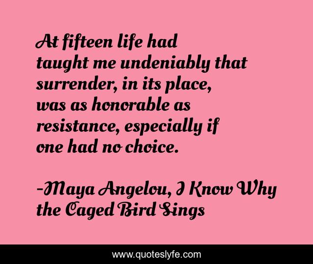This page presents the quote "At fifteen life had taught me undeniably that surrender, in its place, was as honorable as resistance, especially if one had no choice.". Author of this quote is Maya Angelou, I Know Why the Caged Bird Sings. This quote is about surrender, acquiescence,.