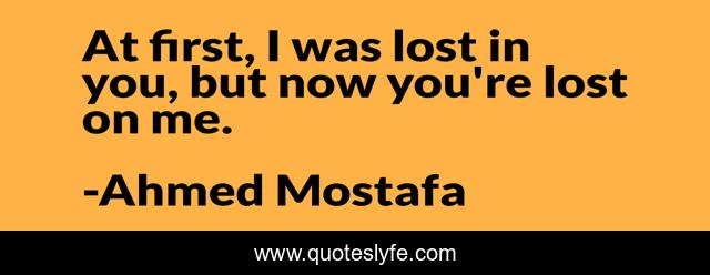 This page presents the quote "At first, I was lost in you, but now you're lost on me.". Author of this quote is Ahmed Mostafa. This quote is about gone, love, love-and-sayings, lost-love, alas, affection, lost-in-love,.