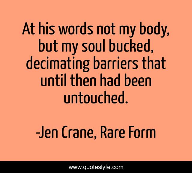 This page presents the quote "At his words not my body, but my soul bucked, decimating barriers that until then had been untouched.". Author of this quote is Jen Crane, Rare Form. This quote is about romance, fantasy,.