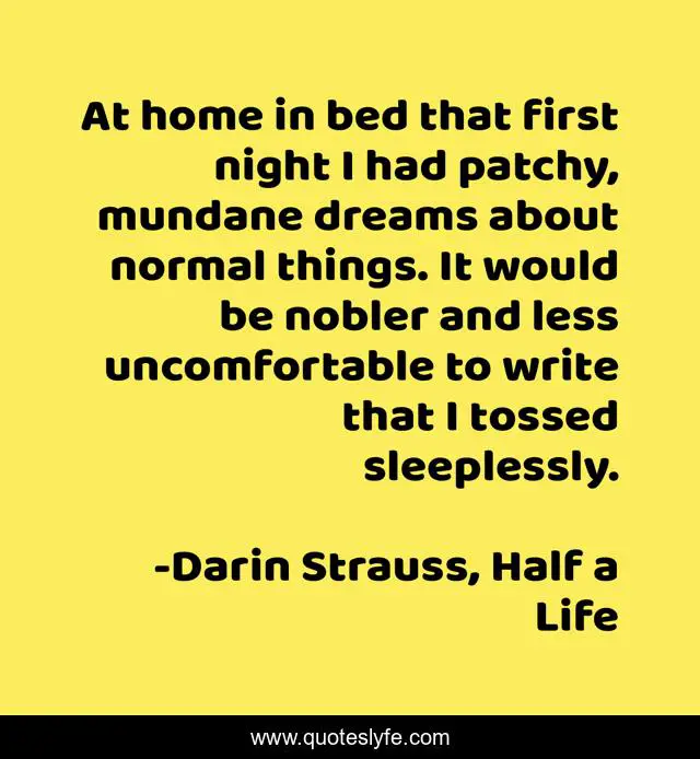 This page presents the quote "At home in bed that first night I had patchy, mundane dreams about normal things. It would be nobler and less uncomfortable to write that I tossed sleeplessly.". Author of this quote is Darin Strauss, Half a Life. This quote is about guilty-conscience, guilt, sleep, dreams-and-reality,.