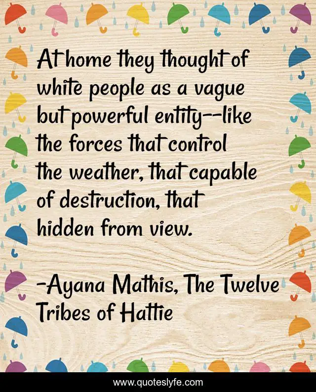 This page presents the quote "At home they thought of white people as a vague but powerful entity--like the forces that control the weather, that capable of destruction, that hidden from view.". Author of this quote is Ayana Mathis, The Twelve Tribes of Hattie. This quote is about race-relations, race,.