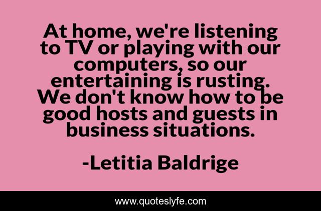 This page presents the quote "At home, we're listening to TV or playing with our computers, so our entertaining is rusting. We don't know how to be good hosts and guests in business situations.". Author of this quote is Letitia Baldrige. This quote is about home, good, business,.