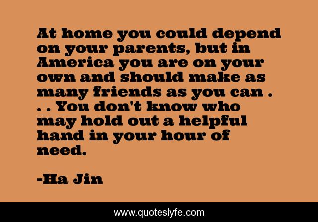 This page presents the quote "At home you could depend on your parents, but in America you are on your own and should make as many friends as you can . . . You don't know who may hold out a helpful hand in your hour of need.". Author of this quote is Ha Jin. This quote is about culture, fiction,.