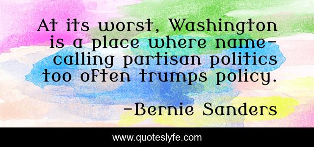 This page presents the quote "At its worst, Washington is a place where name-calling partisan politics too often trumps policy.". Author of this quote is Bernie Sanders. This quote is about worst, place,.