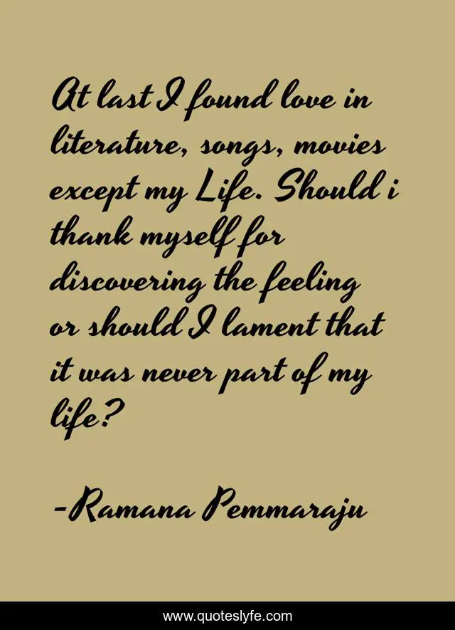 This page presents the quote "At last I found love in literature, songs, movies except my Life. Should i thank myself for discovering the feeling or should I lament that it was never part of my life?". Author of this quote is Ramana Pemmaraju. This quote is about relationships, love, psychology, affection,.