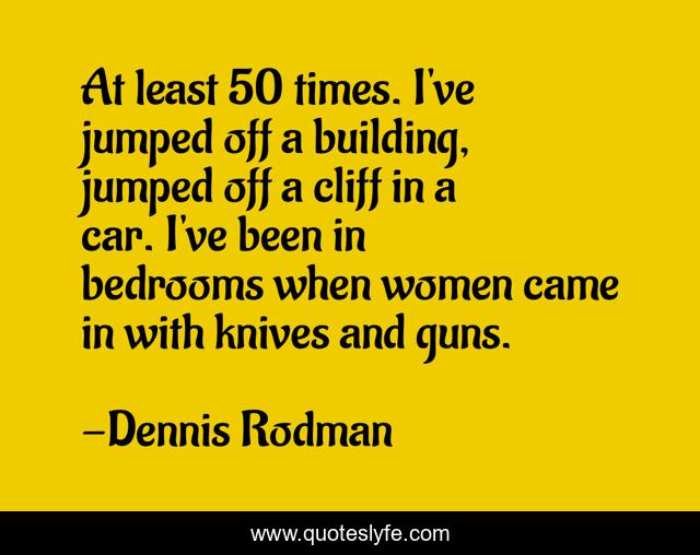 This page presents the quote "At least 50 times. I've jumped off a building, jumped off a cliff in a car. I've been in bedrooms when women came in with knives and guns.". Author of this quote is Dennis Rodman. This quote is about building, car, guns,.