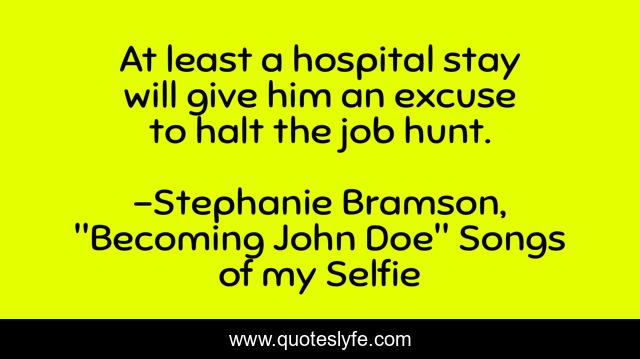 This page presents the quote "At least a hospital stay will give him an excuse to halt the job hunt.". Author of this quote is Stephanie Bramson, "Becoming John Doe" Songs of my Selfie. This quote is about funny, humor, job-seeking, humorous, anthologies, short-stories, jobs, millenials, comedy,.