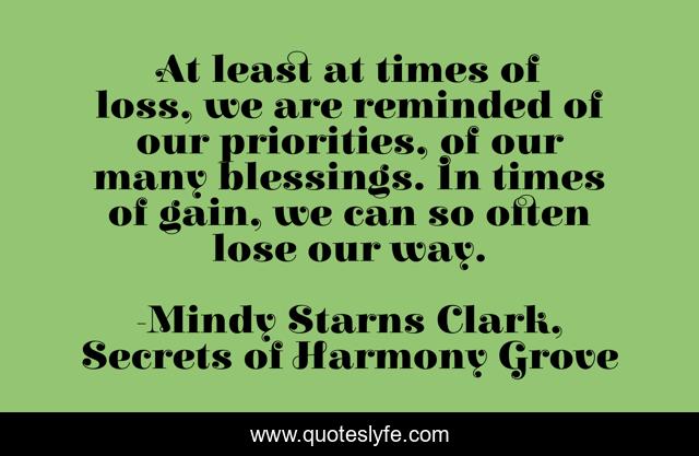 This page presents the quote "At least at times of loss, we are reminded of our priorities, of our many blessings. In times of gain, we can so often lose our way.". Author of this quote is Mindy Starns Clark, Secrets of Harmony Grove. This quote is about enthusiasm, christian-living, inspirational,.