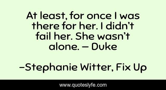 This page presents the quote "At least, for once I was there for her. I didn’t fail her. She wasn’t alone. — Duke". Author of this quote is Stephanie Witter, Fix Up. This quote is about duke, contemporary-romance, patch-up-series, skye, contemporary, new-adult, fix-up, college, college-romance,.
