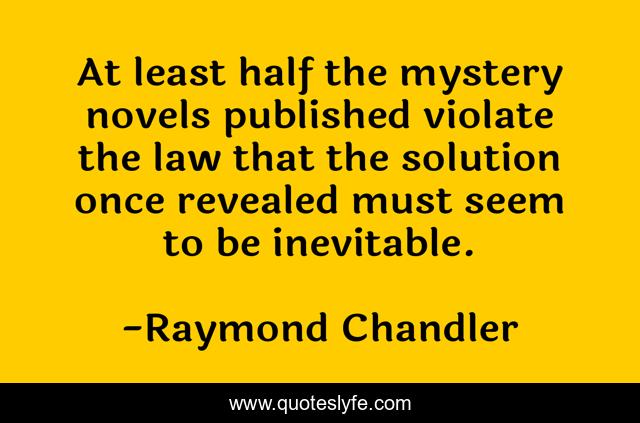 This page presents the quote "At least half the mystery novels published violate the law that the solution once revealed must seem to be inevitable.". Author of this quote is Raymond Chandler. This quote is about writers, writing,.