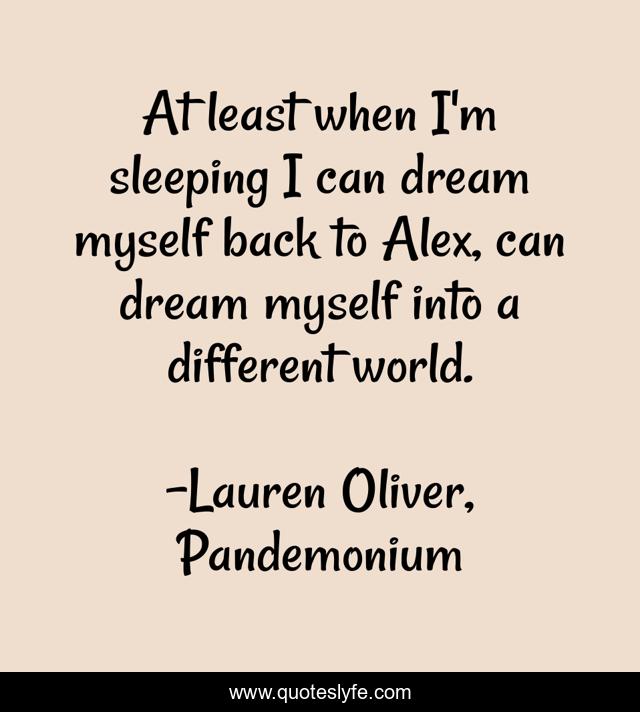 This page presents the quote "At least when I'm sleeping I can dream myself back to Alex, can dream myself into a different world.". Author of this quote is Lauren Oliver, Pandemonium. This quote is about romance, alex, sleep, dreams,.