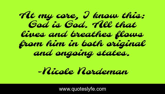 This page presents the quote "At my core, I know this: God is God. All that lives and breathes flows from him in both original and ongoing states.". Author of this quote is Nicole Nordeman. This quote is about living, god, christian, inspirational, enthusiasm,.