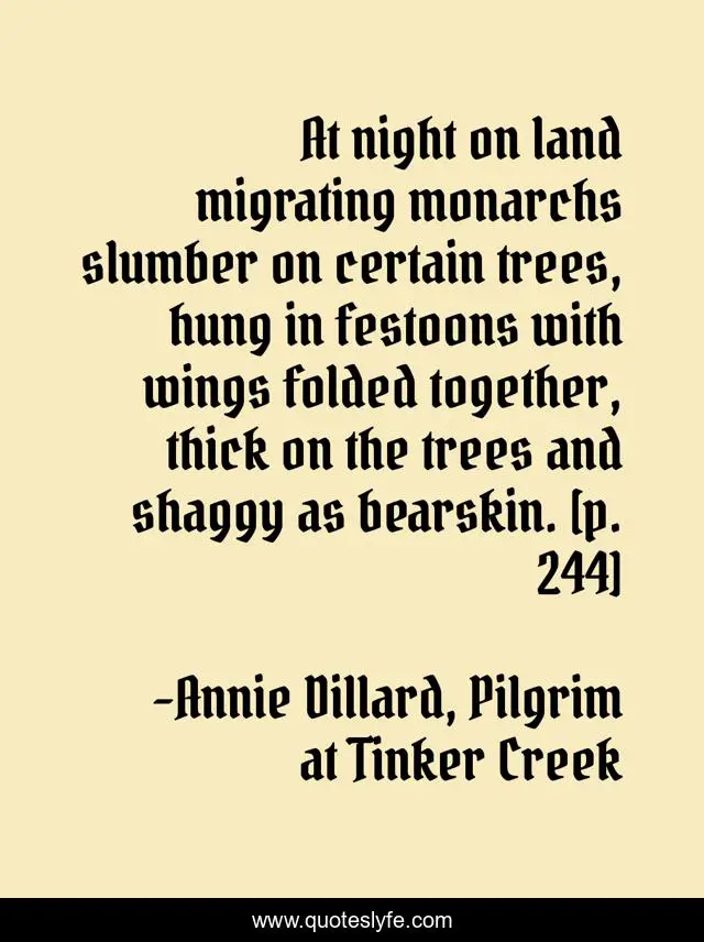 This page presents the quote "At night on land migrating monarchs slumber on certain trees, hung in festoons with wings folded together, thick on the trees and shaggy as bearskin. [p. 244]". Author of this quote is Annie Dillard, Pilgrim at Tinker Creek. .