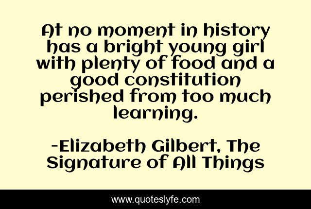 This page presents the quote "At no moment in history has a bright young girl with plenty of food and a good constitution perished from too much learning.". Author of this quote is Elizabeth Gilbert, The Signature of All Things. This quote is about learning, women,.