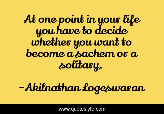 This page presents the quote "At one point in your life you have to decide whether you want to become a sachem or a solitary.". Author of this quote is Akilnathan Logeswaran. This quote is about solitary, life, grandchildren, solitude, storyteller, story, sachem, live,.