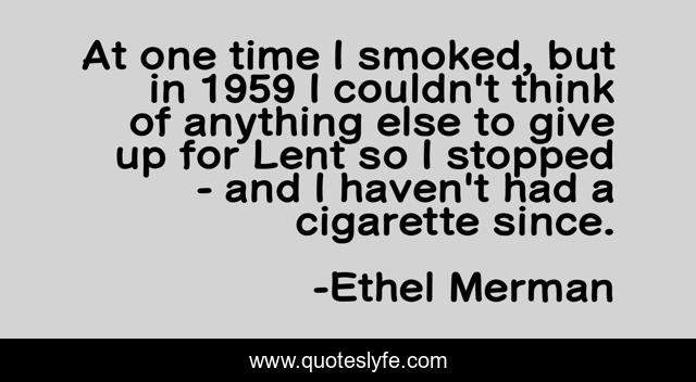 This page presents the quote "At one time I smoked, but in 1959 I couldn't think of anything else to give up for Lent so I stopped - and I haven't had a cigarette since.". Author of this quote is Ethel Merman. This quote is about think, anything, time,.