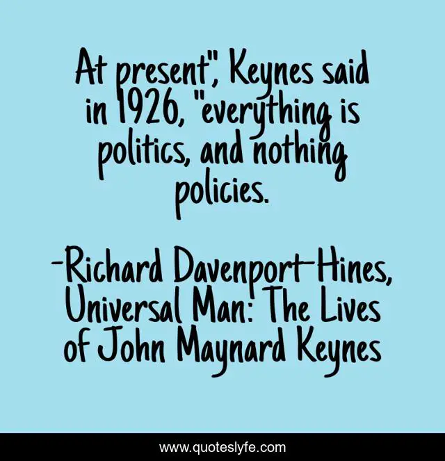 This page presents the quote "At present", Keynes said in 1926, "everything is politics, and nothing policies.". Author of this quote is Richard Davenport-Hines, Universal Man: The Lives of John Maynard Keynes. This quote is about politics, economics, keynes,.