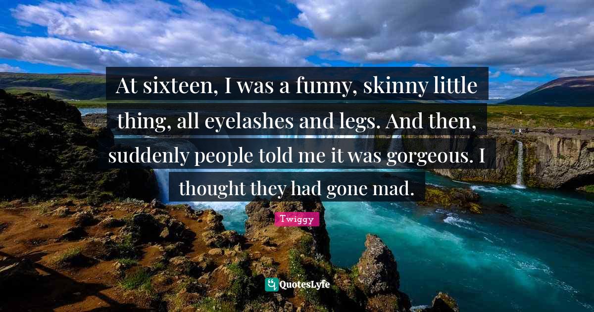This page presents the quote "At sixteen, I was a funny, skinny little thing, all eyelashes and legs. And then, suddenly people told me it was gorgeous. I thought they had gone mad.". Author of this quote is Twiggy. This quote is about sixteen, funny, gorgeous, legs, people, gone, mad, eyelashes, skinny,.