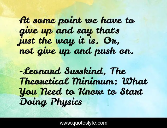 This page presents the quote "At some point we have to give up and say that's just the way it is. Or, not give up and push on.". Author of this quote is Leonard Susskind, The Theoretical Minimum: What You Need to Know to Start Doing Physics. This quote is about science, inspirational, enthusiasm,.