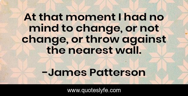 This page presents the quote "At that moment I had no mind to change, or not change, or throw against the nearest wall.". Author of this quote is James Patterson. This quote is about mamimum, ride, mind, maximum-ride, kiss,.