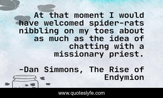 This page presents the quote "At that moment I would have welcomed spider-rats nibbling on my toes about as much as the idea of chatting with a missionary priest.". Author of this quote is Dan Simmons, The Rise of Endymion. This quote is about conversation, priest, missionary,.