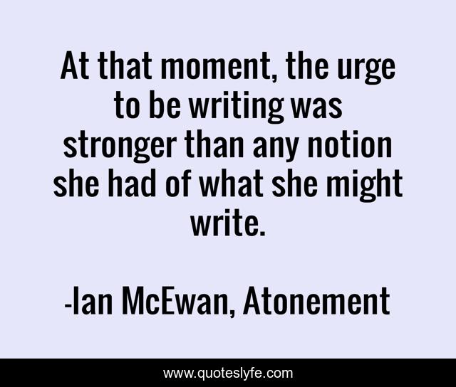 This page presents the quote "At that moment, the urge to be writing was stronger than any notion she had of what she might write.". Author of this quote is Ian McEwan, Atonement. This quote is about inspiration, writing,.