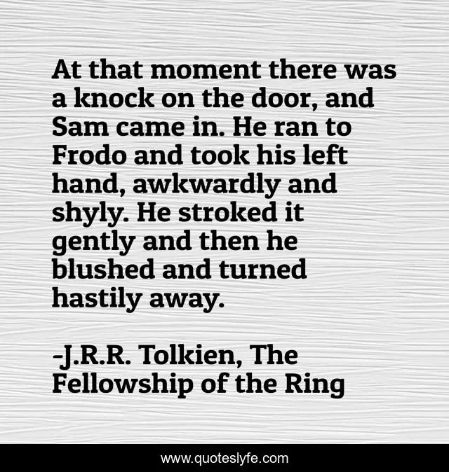 This page presents the quote "At that moment there was a knock on the door, and Sam came in. He ran to Frodo and took his left hand, awkwardly and shyly. He stroked it gently and then he blushed and turned hastily away.". Author of this quote is J.R.R. Tolkien, The Fellowship of the Ring. This quote is about sam, the-lord-of-the-rings, frodo, j-r-r-tolkien, bromance, the-fellowship-of-the-ring, friendship,.