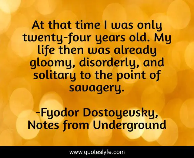 This page presents the quote "At that time I was only twenty-four years old. My life then was already gloomy, disorderly, and solitary to the point of savagery.". Author of this quote is Fyodor Dostoyevsky, Notes from Underground. This quote is about solitary, loneliness, gloomy, savagery, lonely,.