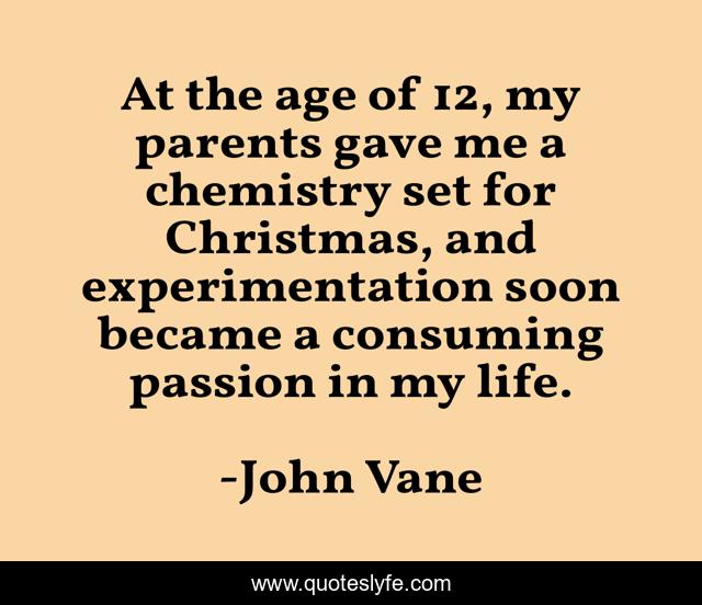 This page presents the quote "At the age of 12, my parents gave me a chemistry set for Christmas, and experimentation soon became a consuming passion in my life.". Author of this quote is John Vane. This quote is about life, parents, age,.