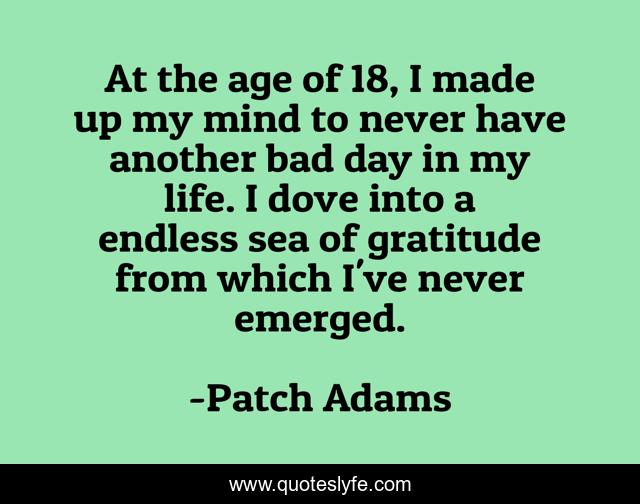 This page presents the quote "At the age of 18, I made up my mind to never have another bad day in my life. I dove into a endless sea of gratitude from which I've never emerged.". Author of this quote is Patch Adams. This quote is about gratitude, life, day,.