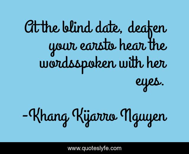 This page presents the quote "At the blind date, deafen your earsto hear the wordsspoken with her eyes.". Author of this quote is Khang Kijarro Nguyen. This quote is about speaking-with-eyes, eyes, blind-date, date, non-verbal-communication, deafen,.