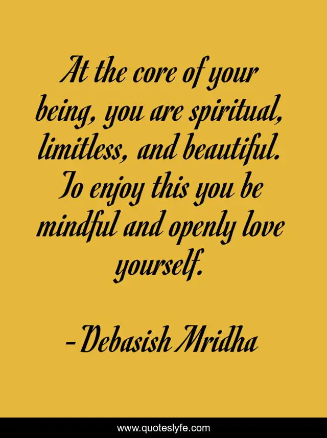 This page presents the quote "At the core of your being, you are spiritual, limitless, and beautiful. To enjoy this you be mindful and openly love yourself.". Author of this quote is Debasish Mridha. This quote is about beautiful, spiritual, debasish, openly-love-yourself, being, mridha, philosophy, debasish-mridha, at-the-core-of-your-being,.