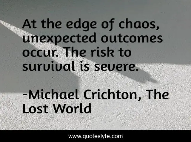 This page presents the quote "At the edge of chaos, unexpected outcomes occur. The risk to survival is severe.". Author of this quote is Michael Crichton, The Lost World. This quote is about survival, chaos,.