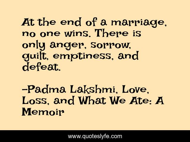 This page presents the quote "At the end of a marriage, no one wins. There is only anger, sorrow, guilt, emptiness, and defeat.". Author of this quote is Padma Lakshmi, Love, Loss, and What We Ate: A Memoir. This quote is about divorce, seperation,.