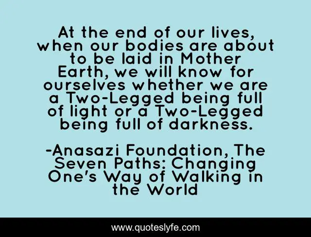 This page presents the quote "At the end of our lives, when our bodies are about to be laid in Mother Earth, we will know for ourselves whether we are a Two-Legged being full of light or a Two-Legged being full of darkness.". Author of this quote is Anasazi Foundation, The Seven Paths: Changing One's Way of Walking in the World. This quote is about death, darkness, nature, light, anasazi-foundation, mother-earth, wisdom, good-buffalo-eagle, healing,.