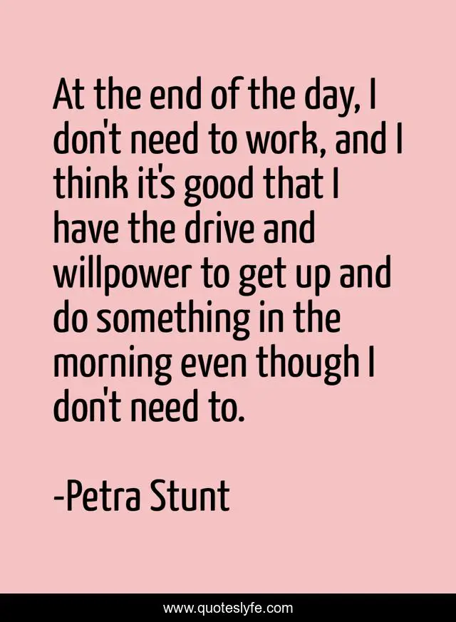 This page presents the quote "At the end of the day, I don't need to work, and I think it's good that I have the drive and willpower to get up and do something in the morning even though I don't need to.". Author of this quote is Petra Stunt. This quote is about work, good, day,.
