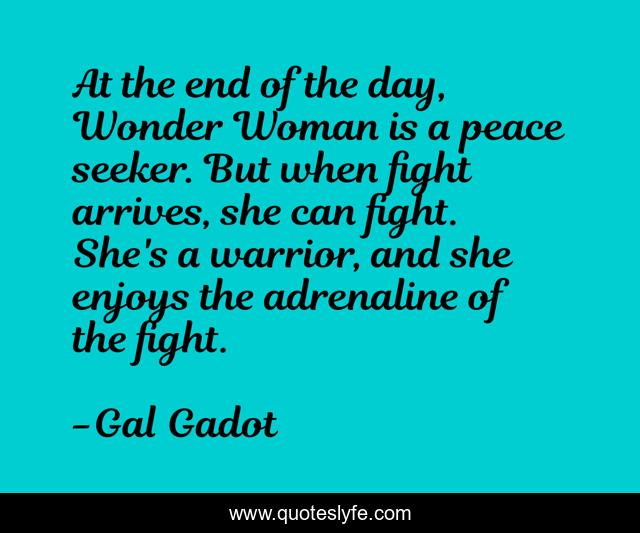 This page presents the quote "At the end of the day, Wonder Woman is a peace seeker. But when fight arrives, she can fight. She's a warrior, and she enjoys the adrenaline of the fight.". Author of this quote is Gal Gadot. This quote is about woman, day, fight,.