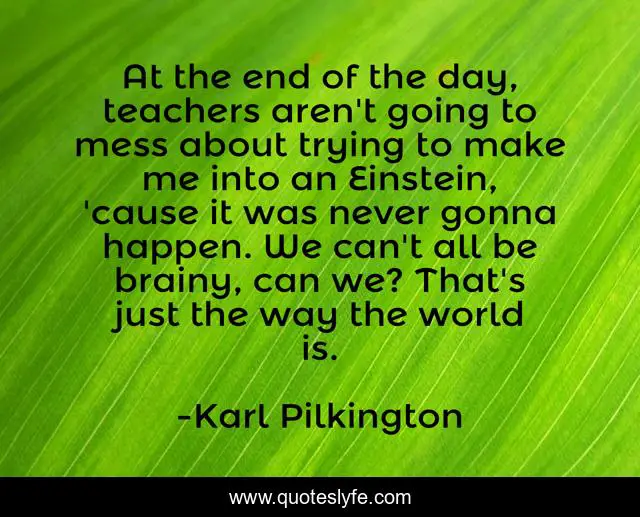This page presents the quote "At the end of the day, teachers aren't going to mess about trying to make me into an Einstein, 'cause it was never gonna happen. We can't all be brainy, can we? That's just the way the world is.". Author of this quote is Karl Pilkington. This quote is about me, world, day,.