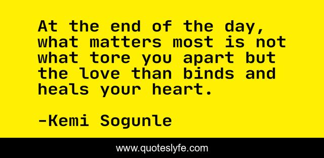 This page presents the quote "At the end of the day, what matters most is not what tore you apart but the love than binds and heals your heart.". Author of this quote is Kemi Sogunle. This quote is about life, moving-forward-in-life, love, love-for-heartbreak, restoration, healing, life-lessons, moving-forward, affection,.