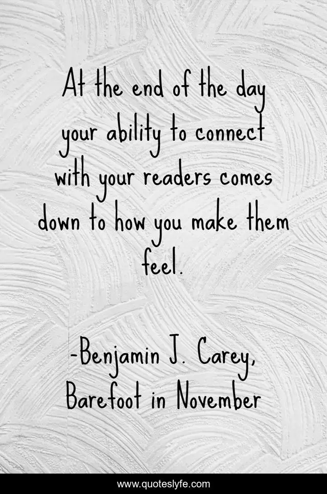 This page presents the quote "At the end of the day your ability to connect with your readers comes down to how you make them feel.". Author of this quote is Benjamin J. Carey, Barefoot in November. This quote is about illness, love, family, books, anger, art, obsession, depression, death,.