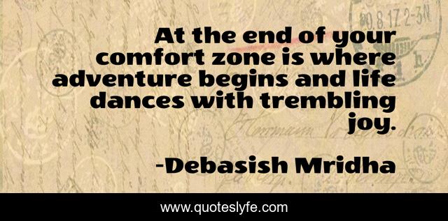 This page presents the quote "At the end of your comfort zone is where adventure begins and life dances with trembling joy.". Author of this quote is Debasish Mridha. This quote is about debasish-mridha, trembling-joy, philosophy, life-dances, quotes, debasish-mridha-md, inspirational, comfort-zone, enthusiasm,.