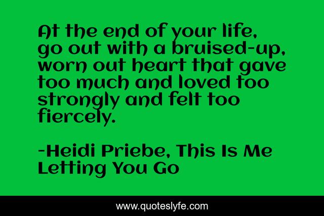 This page presents the quote "At the end of your life, go out with a bruised-up, worn out heart that gave too much and loved too strongly and felt too fiercely.". Author of this quote is Heidi Priebe, This Is Me Letting You Go. This quote is about heartache, loss, pain, inspirational, enthusiasm,.