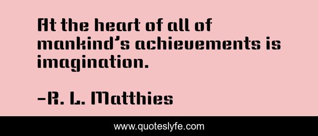 This page presents the quote "At the heart of all of mankind’s achievements is imagination.". Author of this quote is R. L. Matthies. This quote is about enthusiasm, philosophical, factual, inspirational,.