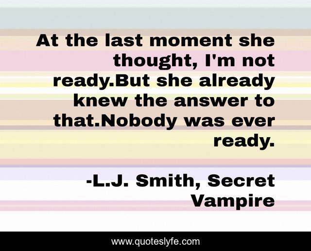 This page presents the quote "At the last moment she thought, I'm not ready.But she already knew the answer to that.Nobody was ever ready.". Author of this quote is L.J. Smith, Secret Vampire. This quote is about death, dying, not-ready, die, i-m-not-ready, ready, unready, unprepared,.