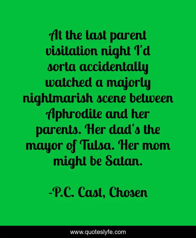 This page presents the quote "At the last parent visitation night I'd sorta accidentally watched a majorly nightmarish scene between Aphrodite and her parents. Her dad's the mayor of Tulsa. Her mom might be Satan.". Author of this quote is P.C. Cast, Chosen. This quote is about humor, vampire,.