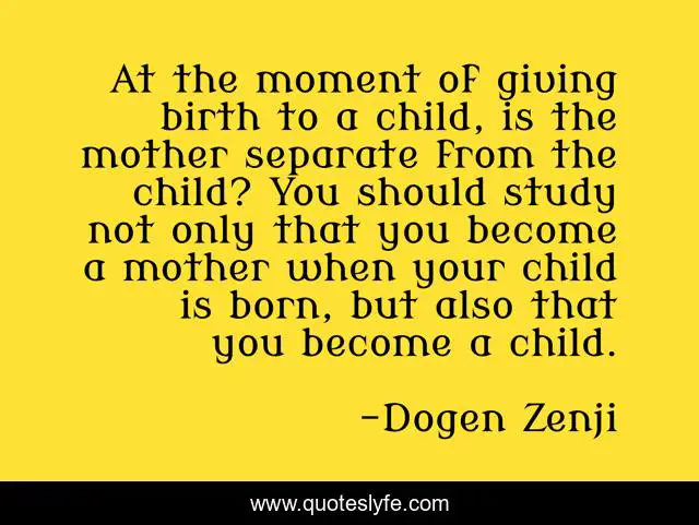 This page presents the quote "At the moment of giving birth to a child, is the mother separate from the child? You should study not only that you become a mother when your child is born, but also that you become a child.". Author of this quote is Dogen Zenji. This quote is about motherhood, birth, zen-buddhism,.